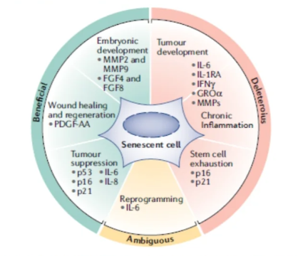 通过多种衰老相关分泌表型(SASP)成分支持肿瘤的发展。