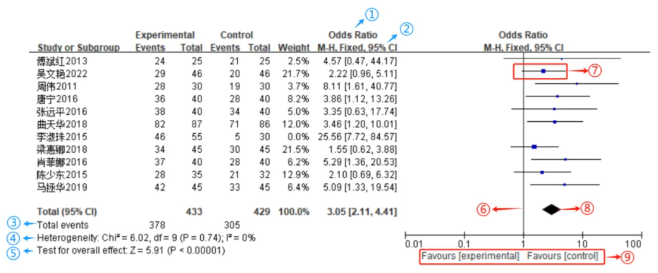 (9)左右区域:左侧为支持试验组,右侧为支持对照组。在该案例中,合并后的结果(菱形)位于右侧,说明对照组的效应量小于试验组的效应量。